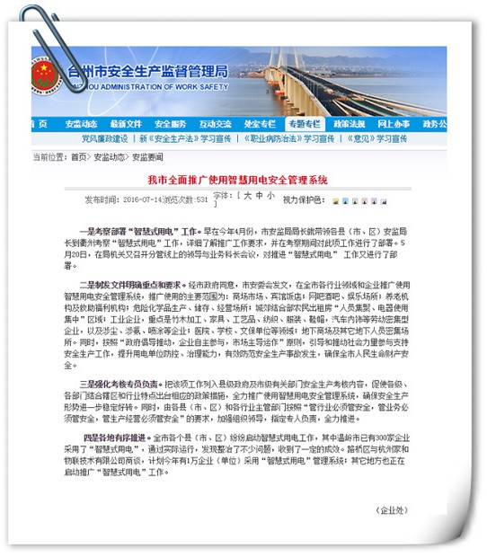 臺州市安監(jiān)局局長就帶領(lǐng)各縣(市、區(qū))安監(jiān)局長到衢州考察“智慧式用電”工作,詳細了解推廣工作要求,并在考察期間對此項工作進行了部署。5月20日,在局機關(guān)又召開分管線上的領(lǐng)導與業(yè)務(wù)科長會議,對推進“智慧式用電”工作又進行了部署。